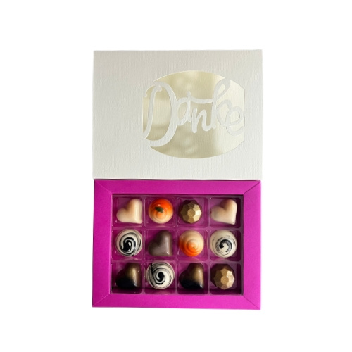 12 Stück feinste, handgemachte Pralinen in der Premiumbox. “Danke”